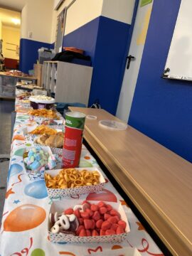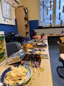Der Tag ging dann mit ausgelassenen Feierlichkeiten in den einzelnen Klassenräumen weiter. Unsere Schüler*innen hatten die Möglichkeit, in fantasievollen Kostümen in ihren Klassen zu glänzen, die von märchenhaften Prinzessinnen und tapferen Rittern bis hin zu außerirdischen Wesen reichten. Die Kinder stellten ihre Kostüme z.B. in Form einer Modenschau vor, bewunderten sich gegenseitig und natürlich durften in diesem bunten Treiben auch Spiele und Tänze nicht fehlen. Zeitungstanz, Stopp-Tanzen, die Reise nach Jerusalem & Co (Stuhltanz) standen statt Mathematik und Deutsch im Stundenplan. Zwischendurch stärkten sich die Kids am Buffet: Bonbons, Chips, Flips, Salzstangen – heute war alles erlaubt! In einigen Klassen fand auch ein gemeinsames Frühstück statt. Die Freude und Kreativität der Kinder sorgten für eine ausgelassene Stimmung.