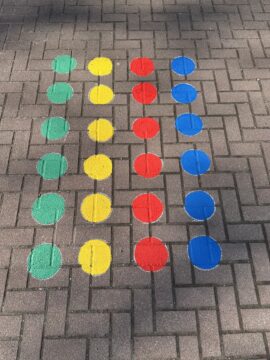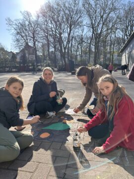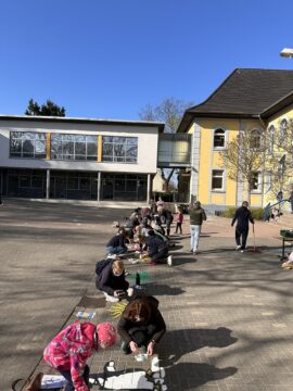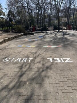 Am 21.03.26 stand wieder einmal eine Schulhofverschönerung an und zwar die Erneuerung der Schulhofbemalung. Leider ist es einfach so, dass die Farben der aufgezeichneten Klassensymbole & Co im Laufe der Zeit immer blasser werden und sogar teilweise irgendwann ganz verschwinden. Das liegt einfach daran, dass wir ja alle regelmäßig darüber laufen, was nicht zu verhindern ist, und Regen sowie Schnee gegen ihr Übriges. Neben den 12 Klassensymbolen sollten in diesem Jahr bei ausreichender Helferzahl auch wieder weitere Spielmöglichkeiten entstehen, wie z.B. Hüpfkästchen, ein Twister-Feld oder ein kleiner Parcours für das Hobbyhorsing, ein großer Wunsch unserer Mädels.