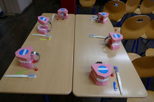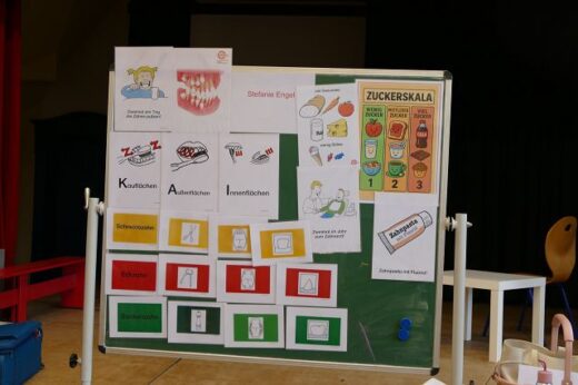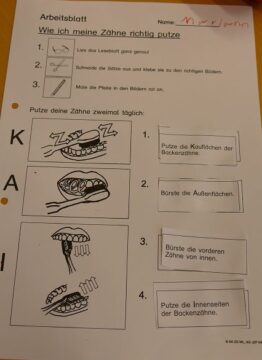 Frau Engel wies noch einmal darauf hin, wie wichtig es ist, pro Halbjahr einmal zum Zahnarzt zu gehen. „Karies ist eine Krankheit. Mama und Papa erkennen nicht immer sofort, ob du Karies hast und du auch nicht. Doch der Zahnarzt, der hat eine Lampe mit einem sehr hellen Licht und sieht Karies.“