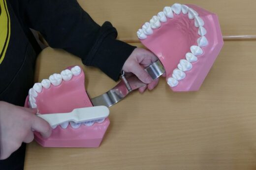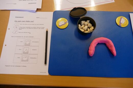 Das wäre ja meine Lieblingsstation gewesen! Hier durfte man den Unterkiefer auf einem Knetkiefer mit Plastikzähnen nachbauen. Frau Engel stand dabei oft hilfreich zur Seite. Am Ende wurden die Ergebnisse noch auf ein Arbeitsblatt übertragen.