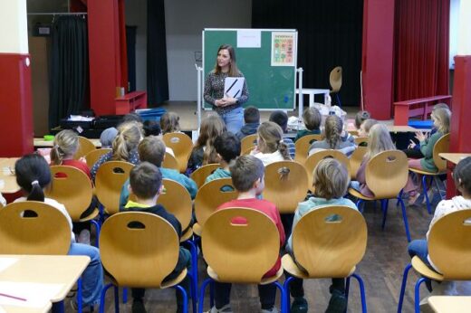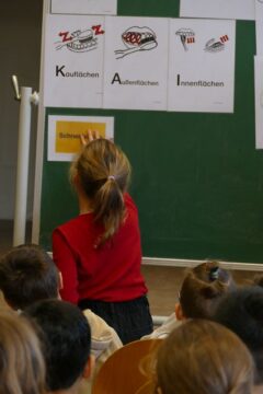 Die Doppelstunde endete mit einer Nachbesprechung. Im Vorfeld hatte sich Frau Engel drei Kids ausgesucht, die ihr dabei halfen und noch einmal die Zahnarten sowie deren Funktionen mündlich allen Kindern erklärten. Das war für Viktoria, Elias und Leni gar kein Problem!