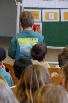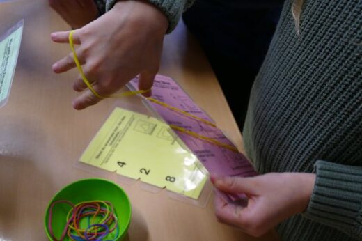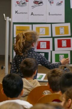 Die Schüler*innen mussten die Sätze lesen und ein Gummi zur richtigen Lösung ziehen. Gar nicht so einfach! Da mussten einige Finger doch kämpfen, aber alle haben den Kampf gewonnen.