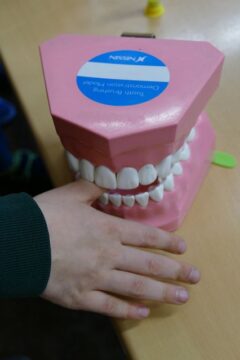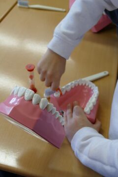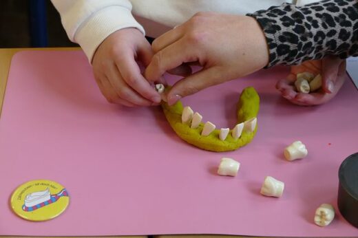 Alle Schüler*innen der Klasse 2b waren heute sehr aktiv dabei und am dem Thema sehr interessiert. Sie hatten sich alles aus Klasse 1 gemerkt und zeigten sich äußerst wissbegierig. Elias stellte schon die Frage, woraus denn eigentlich Zähne bestehen. Frau Engel vertröstete ihn auf das 3. Schuljahr und dort wird er sie dann bei der Beantwortung dieser Frage unterstützen. Das hat sie sich ganz gut gemerkt! Viktoria bewies auch, dass sie eine richtige Zahnexpertin ist. Sie putzt sich sogar täglich dreimal die Zähne und zwischendurch wird auch zu Hause mit Unterstützung von Zahnfärbetabletten kontrolliert, ob sie richtig geputzt hat. Diese Tabletten kann man übrigens in der Drogerie/Apotheke oder online beim Händler Ihres Vertrauens kaufen.