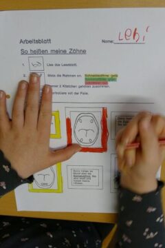 Weiter ging es mit den verschiedenen Zahnarten und deren Funktionen. Schnell wurde erarbeitet, dass jeder Mensch 4 Schneidezähne oben und vier unten im Kiefer hat. Die Schneidezähne sind wie eine Schere und können Nahrung abschneiden. Außerdem hat man jeweils 2 Eckzähne oben und unten. Franek wusste schon, dass diese wie eine Zange arbeiten und die Nahrung abreißen. Seine ältere Schwester Leni hatte ihm das nämlich schon mal erklärt. Da staunte Frau Engel aber. Dazu kommen dann noch jeweils 8 Backenzähne oben und unten, macht insgesamt 28 Zähne. Kurz ging Frau Engel auf die Weisheitszähne ein. Wichtig war ihr noch, dass die Backenzähne Rillen haben und eine Fissurenversiegelung bei den bleibenden Backenzähnen durch den Zahnarzt empfehlenswert ist. Auf jedes Thema sprang die Klasse 2b an und die Zeit lief und lief. Kommentar von Frau Engel: „Okay, ihr Lieben, ich schaue mal auf die Uhr.“ Deshalb war es nun an der Zeit, die verschiedenen Stationen zu besprechen, damit der Stationslauf starten konnte. Die Stationen haben übrigens in der Regel Lösungskarten und so können die Kinder selbstständig kontrollieren, ob sie alles richtig gemacht haben. Toll! Wie immer waren alle Stationen schon morgens vor 8.00 Uhr von Frau Engel aufgebaut worden und so konnte man schnell starten.