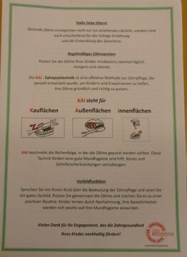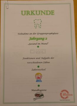 Dann bekam die Klasse noch eine Urkunde, einen Elternbrief zum Thema, ein Mandala und eine Geschichte zum Vorlesen in der Klasse. Und auch im 2. Jahrgang bekam jedes Kind eine Zahnbürste und dazu noch einen Flyer geschenkt. Herzlichen Dank! (Go)
