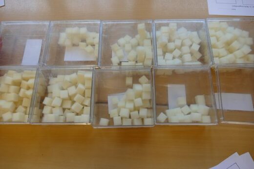 Eine spannende und informative Station! Auf dem Tisch fanden die Kinder fünf Nahrungsmittelbilder und fünf durchsichtige Plastikdosen, die unterschiedliche Mengen an „Würfelzucker“ enthielten. Die Kinder mussten vermuten, welche Zuckermenge in welchen Nahrungsmitteln enthalten sind. Die richtige Lösung konnte durch das Umdrehen der Plastikdosen am Schluss überprüft werden. Dazu gab es ein passendes Arbeitsblatt. So wurde den Kids heute bewusst, wie viel versteckten Zucker es in unseren Lebensmitteln gibt mit dem Ziel einer bewussteren Ernährung. Frau Engels Kommentar zum Arbeitsblatt: „Hört mir jetzt wieder gut zu! Hier gibt es oft Probleme. Eine ganze Längsreihe sind 10 Würfelzucker. So kannst du leichter zählen und rechnen!“ Sie kennt eben ihre „Pappenheimer“.