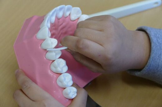 Die Schüler*innen übten auch im 3. Jahrgang an den Modellen, wie die Zähne mit der KAI-Technik geputzt werden müssen. Natürlich wurden auch die Zwischenräume an den Modellen wieder mit Zahnseidesticks gereinigt.