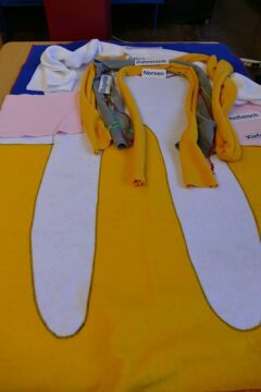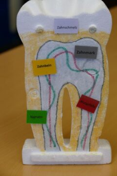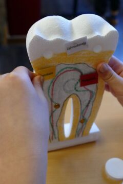 Auf dem Gruppentisch lag ein großer Zahnumriss aus Pappe. Die Schüler*innen legten dann mit Tüchern den Zahnschmelz (weißes Tuch), das Zahnbein (gelbes Tuch), die Blutgefäße (rotes Tuch), die Nerven (grünes Tuch), das Zahnfleisch (rosafarbenes Tuch) und das Zahnmark (graues Tuch) nach. Außerdem mussten sie laminierte Namenskärtchen richtig zuordnen.