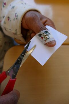 Die Kinder stempelten an dieser Station viermal einen Zahn auf ein Arbeitsblatt in vier Kästchen. Sie malten dann mit einem schwarzen Stift ein Loch in den Zahn, das von Stempelbild zu Stempelbild größer wurde. Dazu schrieben sie die Signalwörter, die auf dem Arbeitsblatt unterstrichen waren, ab. So entwickelten die Schüler*innen ein Verständnis für die Entstehung von Karies und konnten ihr Sachwissen zu dieser Thematik erhöhen, was sie hoffentlich dazu motiviert, noch mehr auf ihre Zahnpflege zu achten. Am Schluss mussten sie deshalb noch in eigenen Worten formulieren, was sie tun können, um keine Karies zu bekommen.