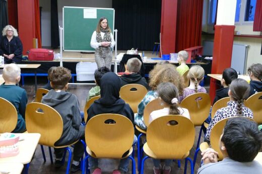 Auch die Klasse 4a zeigte sich sehr interessiert und die Kids hatten sich viele Inhalte aus den letzten drei Jahren gut gemerkt. Sie stellten auch offen sofort Fragen, wenn sie etwas nicht mehr wussten. So fragte Mats nach, warum die bleibenden Backenzähne denn versiegelt werden müssen. Frau Engel erklärte, dass die Backenzähne Rillen und Furchen haben, sich schnell etwas darin festsetzen kann und sich dabei auch Bakterien bilden können. Und das ist nicht gut für den Zahn, schnell kann sich dann eine Karies bilden.