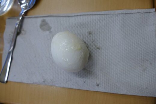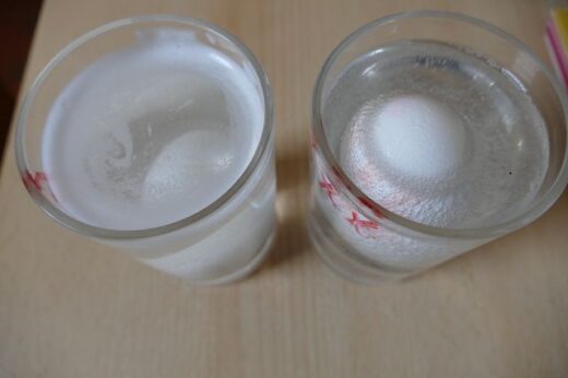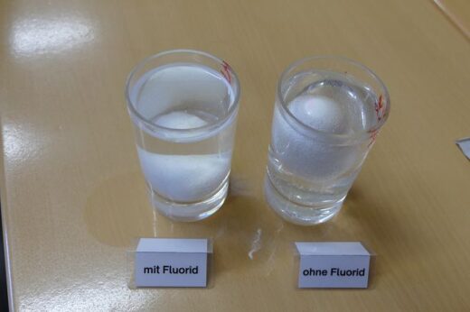 Am Schluss der Doppelstunde ging es noch einmal um das o.a. Experiment (Station 1). Das Elmex-Ei mit den Fluoriden war auf den Boden gesunken und darum herum war eine Art Schutzschicht zu sehen. Das nicht behandelte Ei schwamm oben im Wasser und wurde von vielen Blubberbläschen angegriffen.