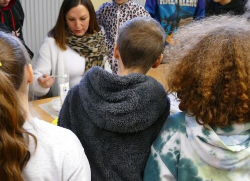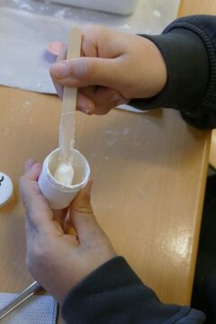 Eine heißbegehrte Station! Deshalb wählte Frau Kastelan, Klassenlehrerin der Klasse 4a, nach und nach immer 6 Kinder aus, die starten durften. Am Schluss hatte natürlich jedes Kind seine Zahnpasta angerührt und Frau Engel hat auch an die fünf kranken Kids gedacht und für sie Zahnpasta zusammengemischt.