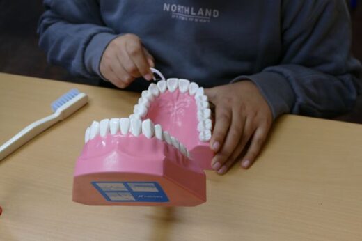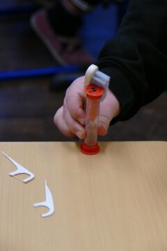 Die Schüler*innen übten auch im 4. Jahrgang noch einmal an den Modellen, wie die Zähne mit der KAI-Technik geputzt werden müssen. Die Sanduhren wurden gestellt und natürlich wurden auch die Zwischenräume an den Modellen wieder mit Zahnseidesticks gereinigt.