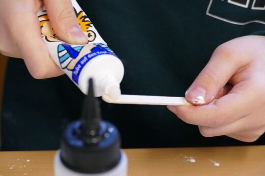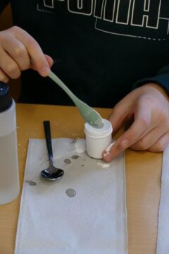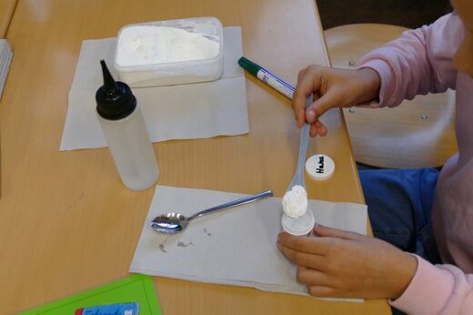„Nimm dir ein Döschen und schreibe auf den Deckel deinen Namen drauf.“ Frau Engel zeigte, wie es geht und alle Kinder standen im Kreis um die Gruppentische herum. „Gebe zuerst einen Teelöffel Glyzerin in deine Dose. Dann kommt ein gehäufter Teelöffel Schlämmkreide dazu sowie eine Rührspatelspitze Fluorid. Nun musst du alles gut umrühren. Wähle dann eine Geschmacksrichtung aus. Du kannst zwischen Pfefferminze, Früchtecocktail, Blutorange und Zitrone wählen. Deine Lehrerin gibt dann davon 1-2 Tropfen in deine Zahnpasta.“
