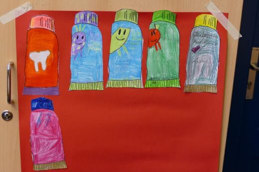 Hier erhielten unsere Mädchen und Jungen die Aufgabe, Werbung für ihre erfundene Zahnpasta zu machen. Sie durften eine Tube nach ihren Vorstellungen gestalten, in ihren Lieblingsfarben, mit dem Emblem des Lieblingsvereins, mit ihrem Kuscheltier … Dann musste das Bild ausgeschnitten und auf ein Plakat geklebt werden.