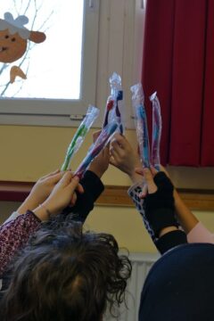 Auch im 4. Jahrgang gab es dann noch eine Urkunde, einen Elternbrief und ein Kreuzworträtsel zum Thema Zähne. Das Kreuzworträtsel fanden die Schüler*innen ganz toll. Aber noch besser war es, dass es auch hier noch eine Zahnbürste gab, plus Flyer natürlich. Nur die Farbwahl ist in jedem Jahrgang immer ein klitzekleines Problem!