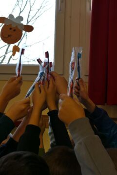 Es ist sehr wichtig, dass Zahnpasta Fluorid enthält, denn Fluorid schützt die Zähne vor Karies. Frau Engel forderte die Kinder auf, gut darauf zu achten, denn es gibt auch Sorten ohne Fluoride. Fluoride sind ein Stoff der Natur. Sie helfen, Kariesschäden an den Zähnen zu verhüten bzw. sie so klein wie möglich zu halten. Fluoride bewirken, dass der Zahnschmelz nach einem Säureangriff wieder repariert und die Bildung von Karies verhindert wird. Fluoride sind zudem ein natürlicher Baustein des Körpers, der auch für die Knochenbildung und das Wachstum unentbehrlich ist. Allerdings darf man auch nicht übertreiben und z.B. täglich die Zähne zusätzlich mit Elmex Gelee oder einem Alternativprodukt putzen. Dann können dadurch evtl. weiße Flecken auf den Zähnen entstehen, sogenannte white spots. Elmex Gelee & Co darf nur einmal in der Woche nach dem normalen Zähneputzen benutzt werden.