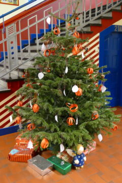 Im Eingangsbereich steht unser Weihnachtsbaum, der traditionell immer vom 3. Jahrgang geschmückt wird. Ein dickes Lob an unsere Klassen 3a, 3b und 3c. Das habt ihr toll gemacht! Unser Baum sieht wirklich wieder schön aus. Gesponsert wurde er in diesem Jahr von Familie Tiris.