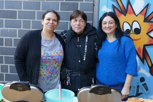 Drei Mütter kümmerten sich zusammen darum, Waffeln zu backen. Da gab es viel zu tun! Achtung! Ein heißes Geschäft! Der Teig wurde von Eltern der Schule zu Hause vorbereitet und vorbeigebracht.