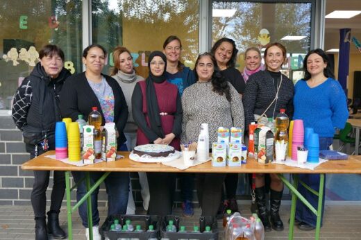 Hier sieht man Frau Tiris, 1. Vorsitzende unseres Fördervereins, mit den Helferinnen, die heute vor Ort waren, um Kuchen, Kaffee, Brötchen & Co auszugeben. Vorher musste natürlich alles vorbereitet und am Schluss wieder aufgeräumt werden.