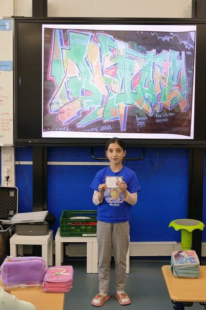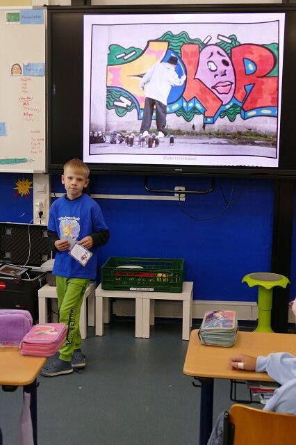In der Klasse 4a bereitete Frau Kastelan das nächste Kunstprojekt vor. Graffiti steht als Thema an! Die Schüler*innen schlüpften in die Lehrerrolle und durften ihren Mitschülerinnen und Mitschülern Fragen, die auf Fragekärtchen standen, stellen.