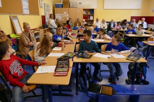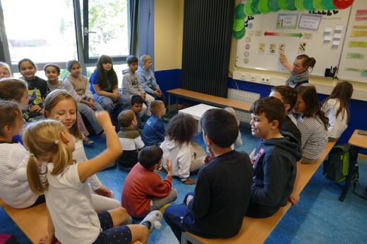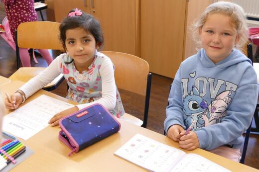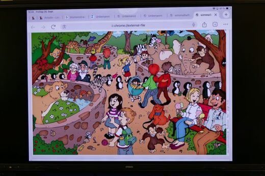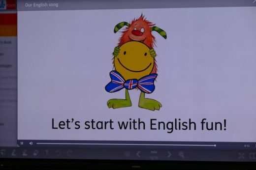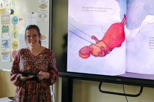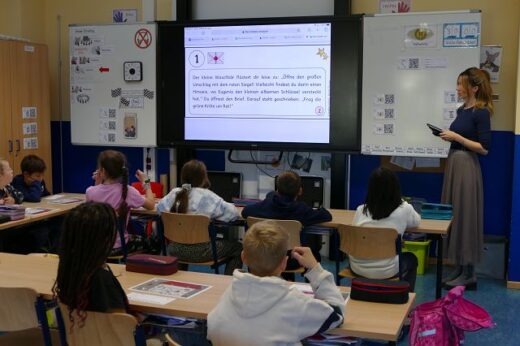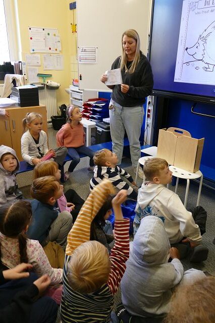In der Klasse 2a war bei der neuen Klassenlehrerin Frau Ophaus das Bilderbuch Zuhause kann überall sein Thema. Sie zeigte die Bilder mit Hilfe der digitalen Tafel und die Schüler*innen lasen die Texte vor. Alle waren eifrig dabei!