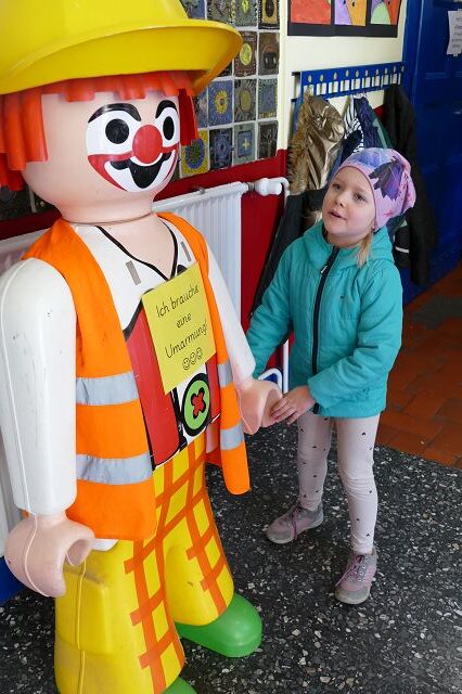 Beim Betreten unserer Wilhelmschule gaben einige kleine Besucher*innen unserem Playmobilmännchen Willi erst mal die Hand. Oh, wie süß! Die Schulfotografin kam gerade vorbei. Grins!