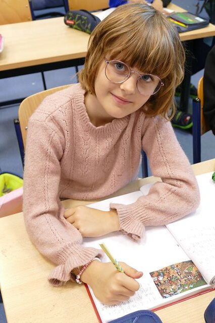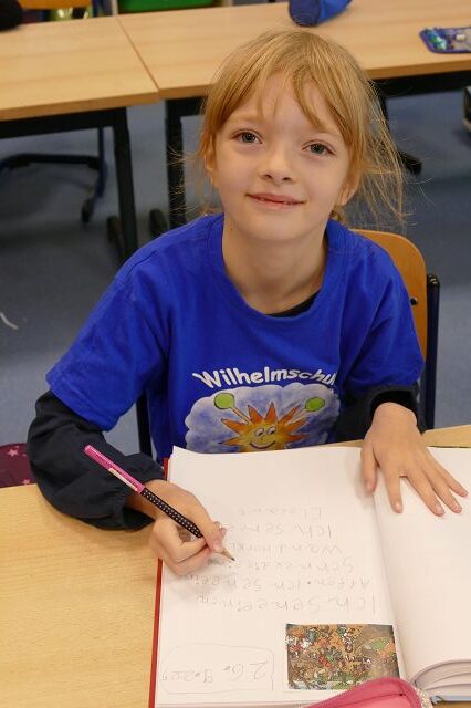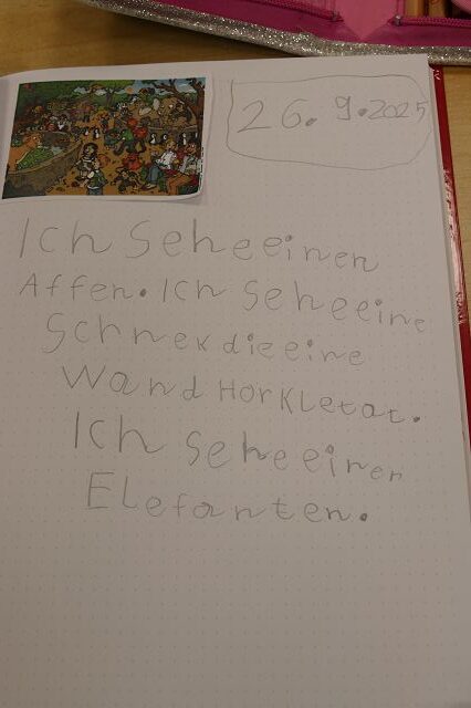 Frau Dieninghoff, Klassenlehrerin der Klasse 2b, hatte den Kids ein Wimmelbild mitgebracht und alle waren eifrig dabei, dazu etwas in ihr Text-Schatz-Buch zu schreiben. Natürlich musste man unbedingt Frau Dieninghoff zeigen, was man alles geschrieben hatte.