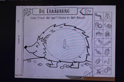 Um den Igel ging es im Sachunterricht der Klasse 1c. Frau Scheller, Klassenlehrerin, präsentierte in einem Kamishibai, was Igel gerne fressen. Danach ging es damit weiter, ein kleines Igelheftchen zu erstellen und die Aufgaben darin zu lösen.