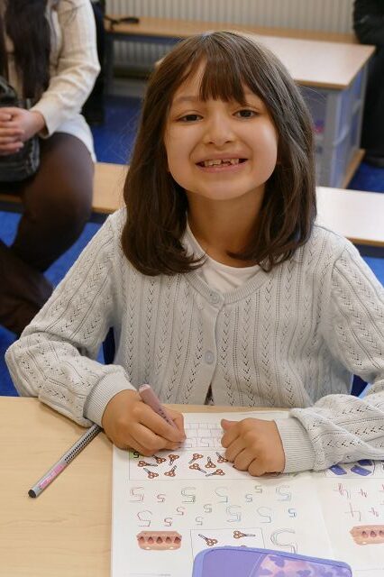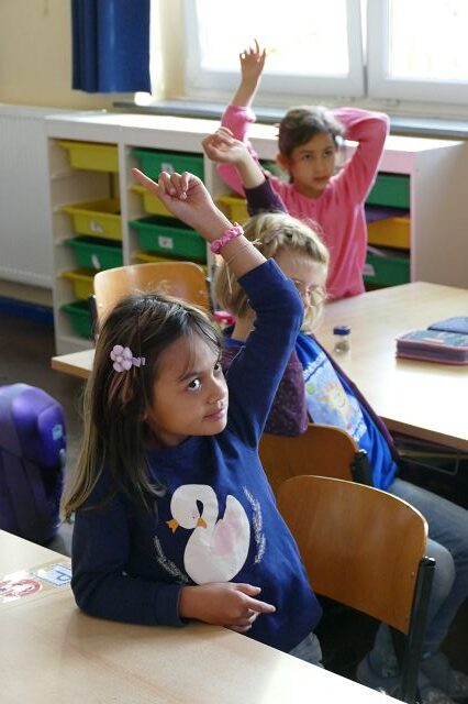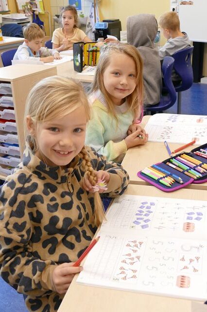Frau Masoud, Klassenlehrerin der Klasse 1a, war leider erkrankt und Frau Vogt erteilte den Mathematikunterricht. Heute stand die Einführung der Ziffer 5 auf dem Programm. Dabei gab es einen tollen Spruch, der vielen Mädchen und Jungen half, die richtige Schreibweise zu nutzen: Langer Hals, dicker Bauch und oben noch ’ne Mütze drauf!