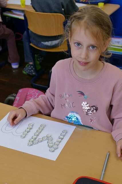 In der Klasse 1b bei Frau Nehm, Klassenlehrerin, stand die Einführung des Buchstabens Mm an. Die Kinder durften dabei kneten, Muggelsteine legen, das Mm schreiben üben und mussten überlegen, wo sich denn dieser Laut im Wort versteckt hatte: vorne, in der Mitte oder hinten?