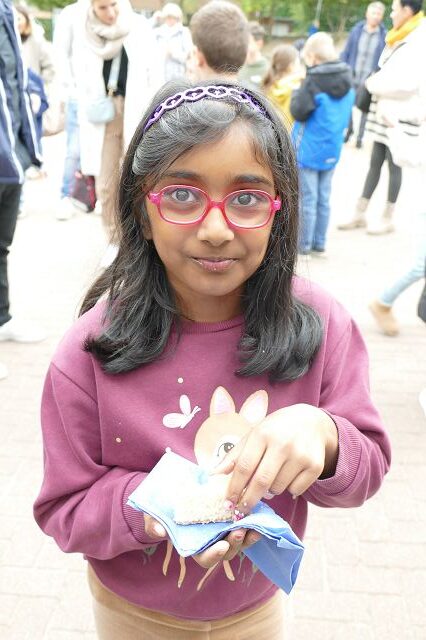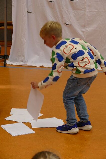 Zwischendurch mussten noch drei Sieger*innen ermittelt werden. Alle Eltern, die in Klasse 1 bis zur Einschulungsfeier neu in den Förderverein eintreten, kommen immer in die große Lostrommel und haben die Chance, einen Preis zu gewinnen. Unser Glücksbote hieß in diesem Schuljahr Emil, der aus den Fördervereinsbeitrittsbögen, die Herr Pyka auf dem Boden ausgebreitet hatte, nacheinander drei zog: Platz 3, Platz 2 und dann Platz 1.