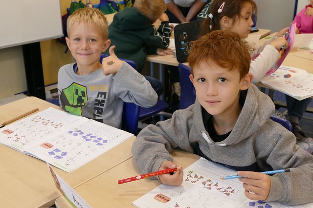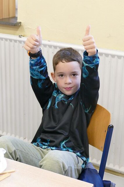 Frau Masoud, Klassenlehrerin der Klasse 1a, war leider erkrankt und Frau Vogt erteilte den Mathematikunterricht. Heute stand die Einführung der Ziffer 5 auf dem Programm. Dabei gab es einen tollen Spruch, der vielen Mädchen und Jungen half, die richtige Schreibweise zu nutzen: Langer Hals, dicker Bauch und oben noch ’ne Mütze drauf!