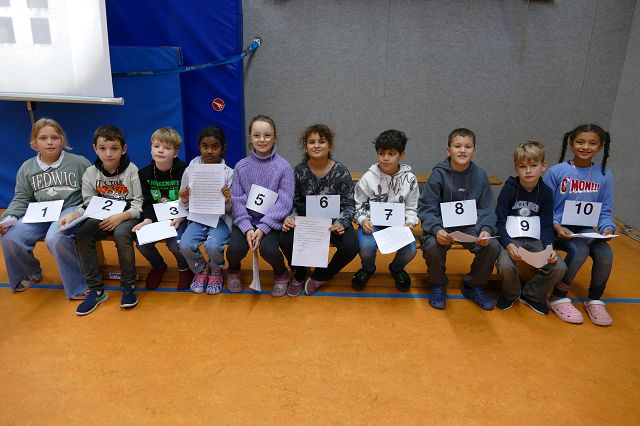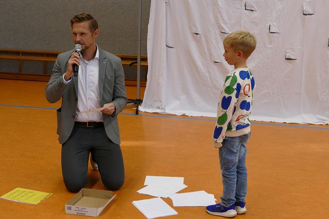 Zwischendurch mussten noch drei Sieger*innen ermittelt werden. Alle Eltern, die in Klasse 1 bis zur Einschulungsfeier neu in den Förderverein eintreten, kommen immer in die große Lostrommel und haben die Chance, einen Preis zu gewinnen. Unser Glücksbote hieß in diesem Schuljahr Emil, der aus den Fördervereinsbeitrittsbögen, die Herr Pyka auf dem Boden ausgebreitet hatte, nacheinander drei zog: Platz 3, Platz 2 und dann Platz 1.